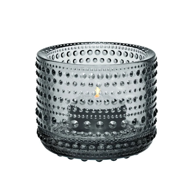 Iittala’s Kastehelmi tealight holder is part of the popular glass collection designed by Oiva Toikka. In 1964 Toikka’s aim was to design a pattern that would conceal the joint marks in pressed glass. The result was Kastehelmi, Finnish for dewdrop, that features delicate glass droplets arranged in a series of rings. Kastehelmi became one of Toikka’s most beloved series of glassware and it was manufactured until 1988. The most popular items were brought back to Iittala’s production in 2010. Kastehelmi plays with light in the most beautiful way and suits any table setting.