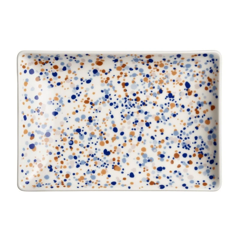 Iittala’s rectangular plate from the Oiva Toikka Collection is adorned with the multicoloured Helle print, originally designed for Arabia in the 1980s. The A5-sized plate can be used as a breakfast plate or a serving dish.
