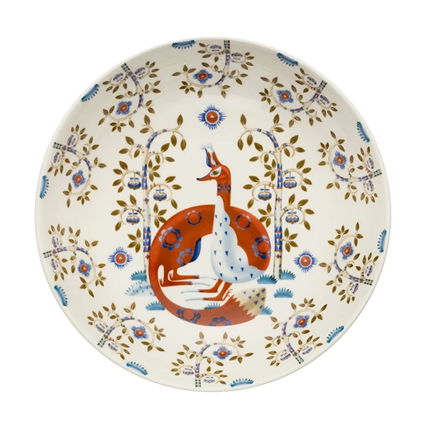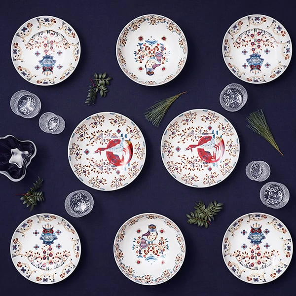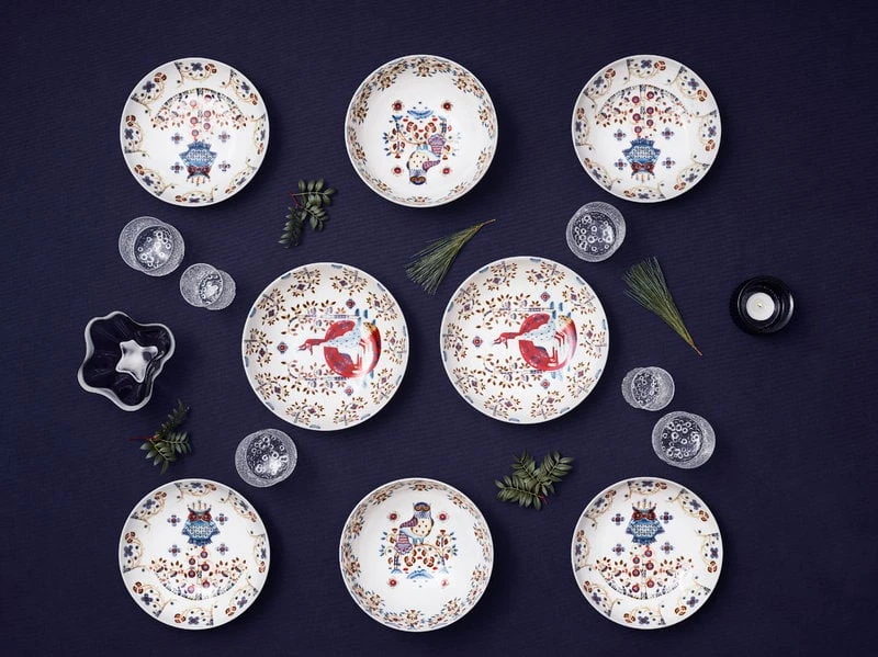Taika is a collection of tableware and decor items adorned by the fascinating illustrations of Klaus Haapaniemi. The simple form of the textiles, boxes and Heikki Orvola’s dinnerware functions as a perfect setting for Haapaniemi’s alluring characters of folklore and fairy tales. With Iittala’s Taika, Finnish for magic, you can decorate your home with beautiful little stories.